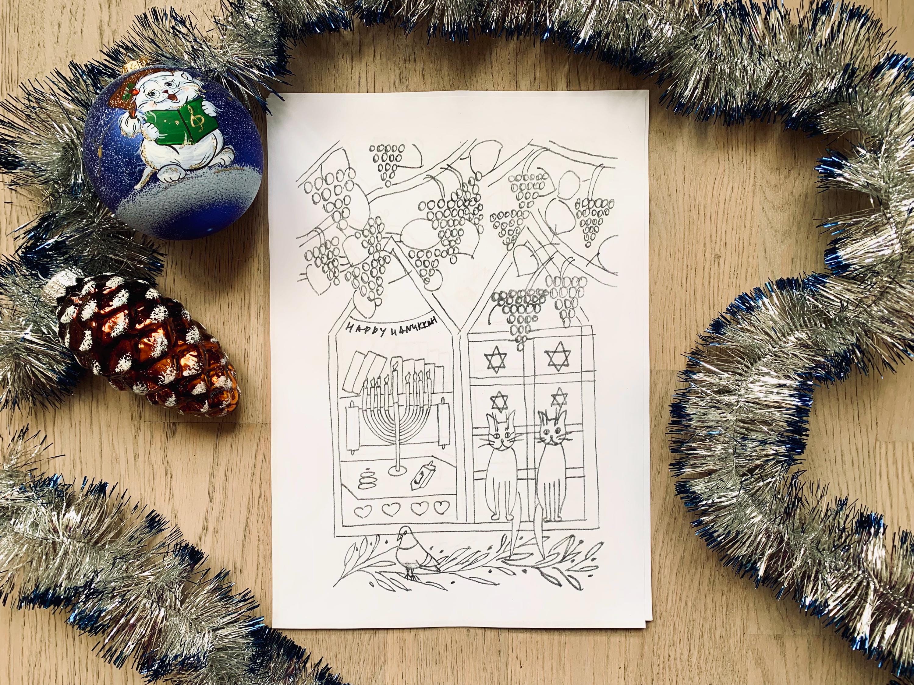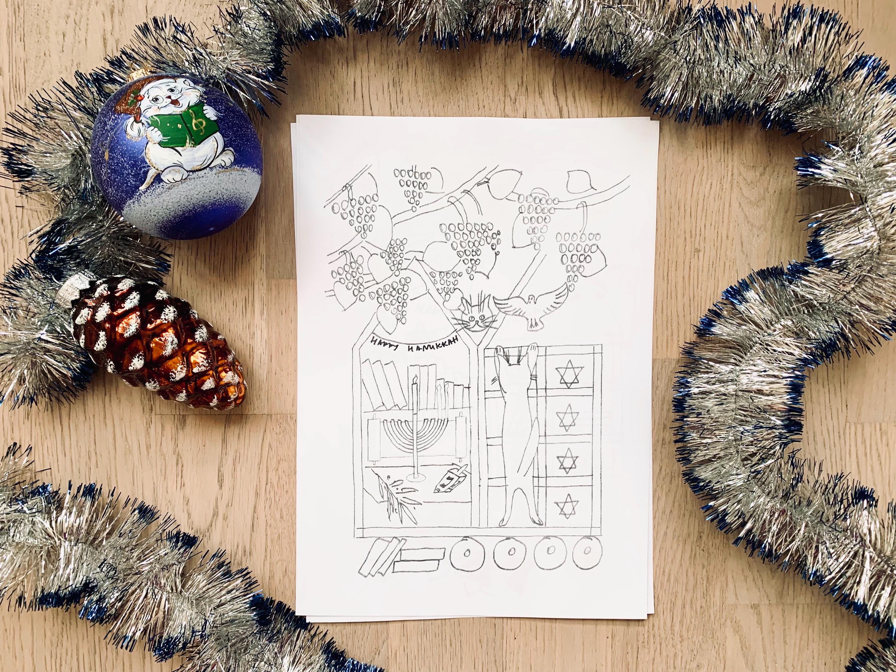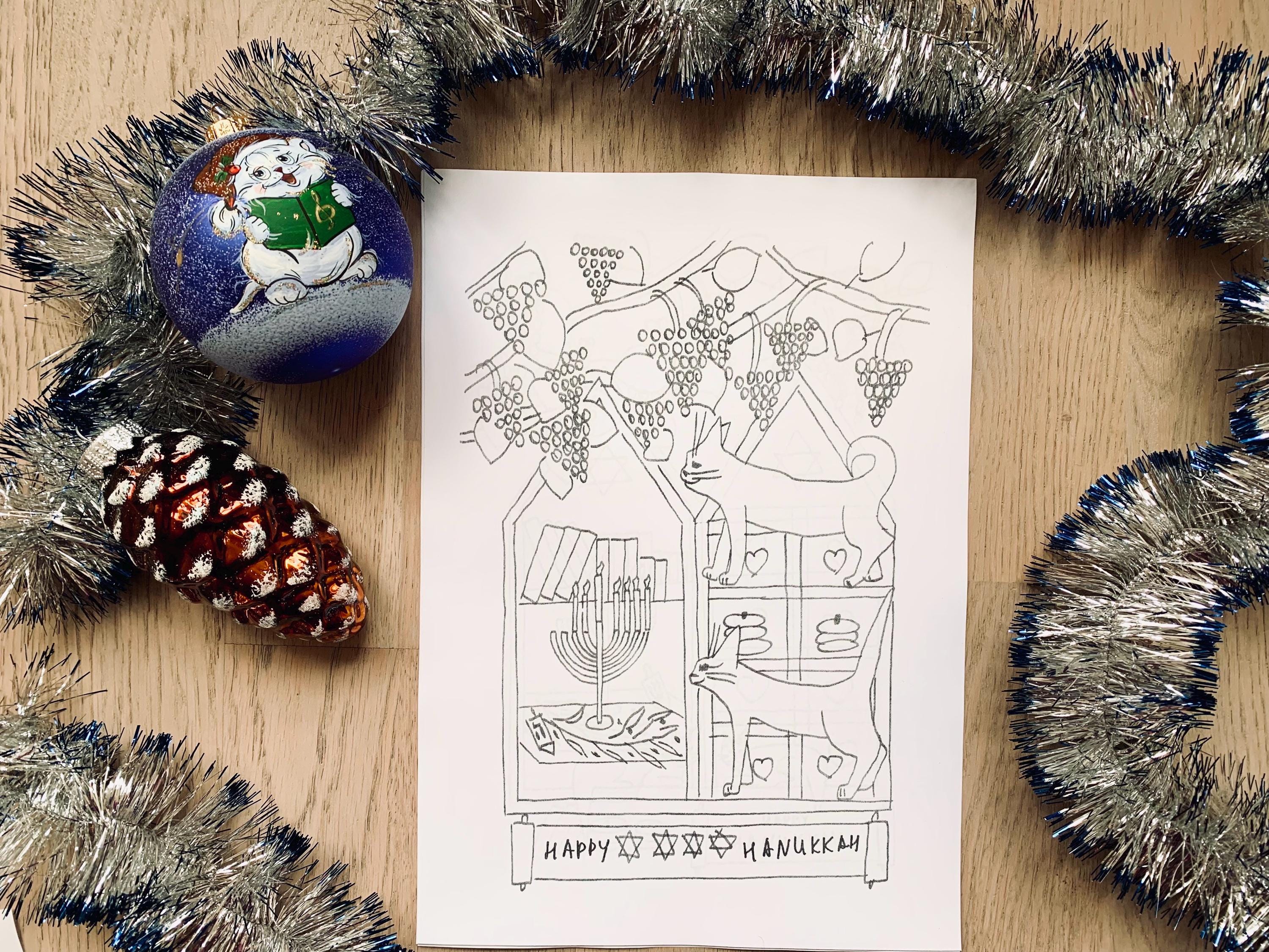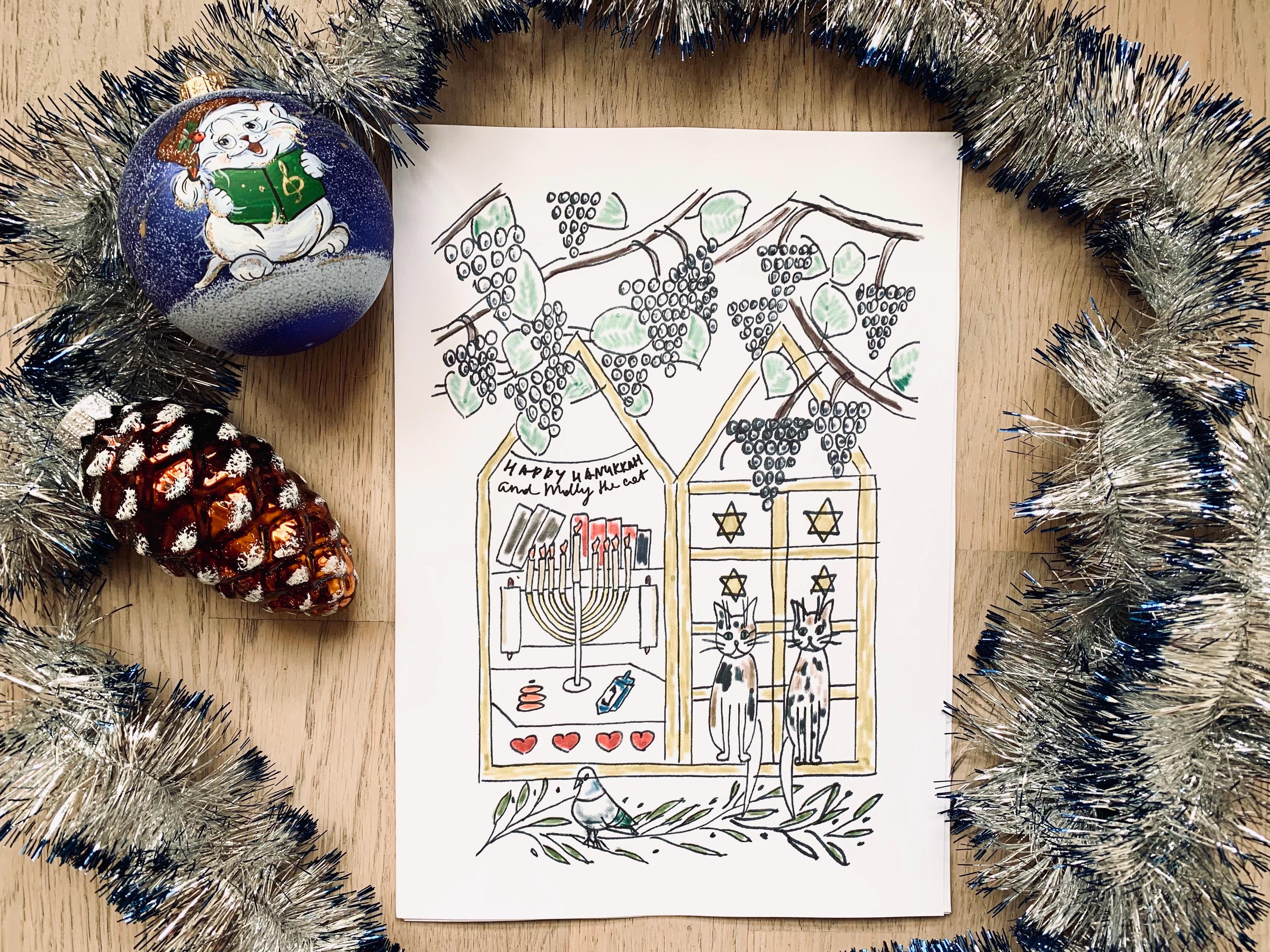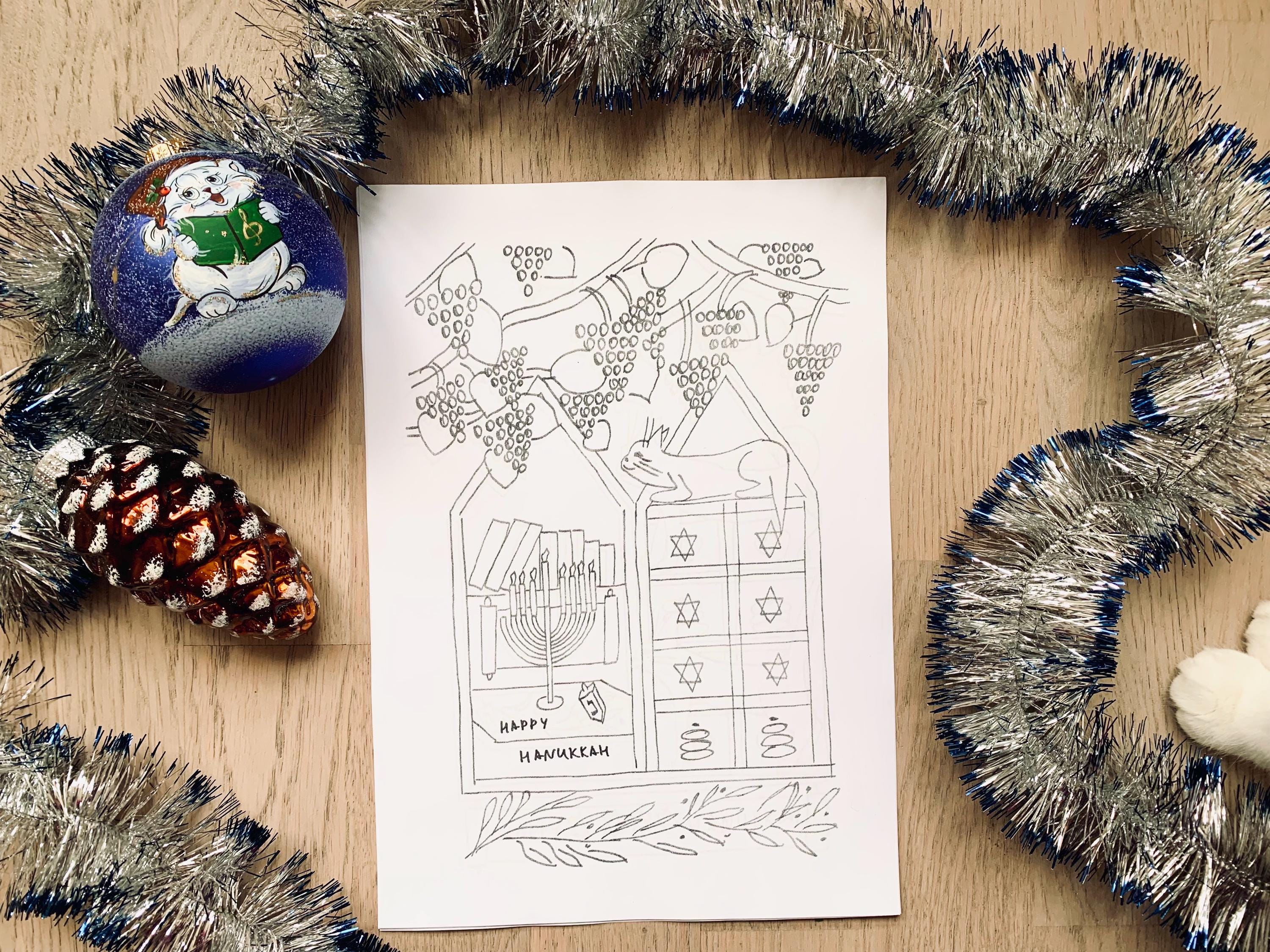 This cozy hand-drawn Coloring set captures the warmth of the Festival of Lights - menorahs, dreidels, candles, and sweet winter moments with Molly the cat.