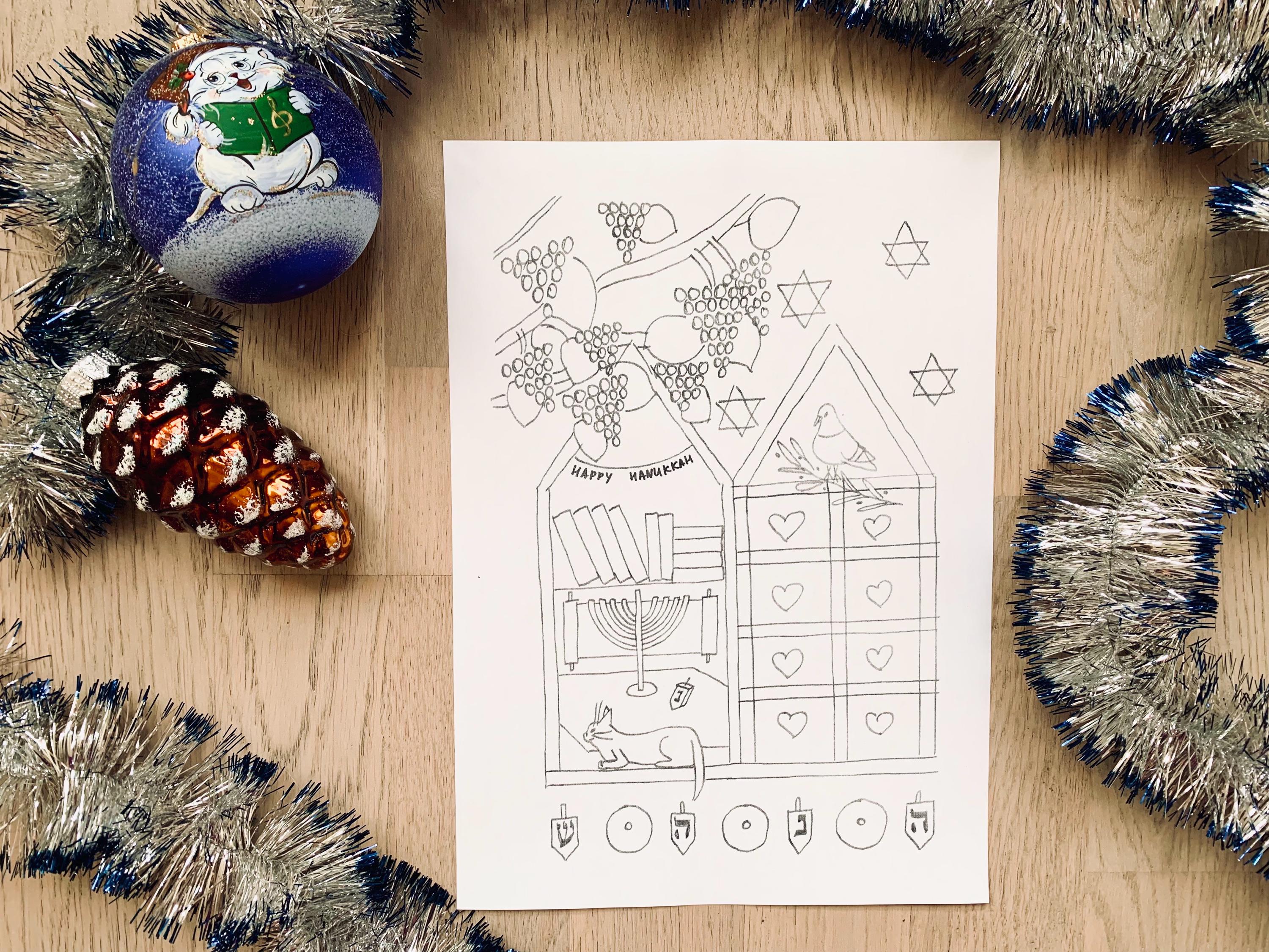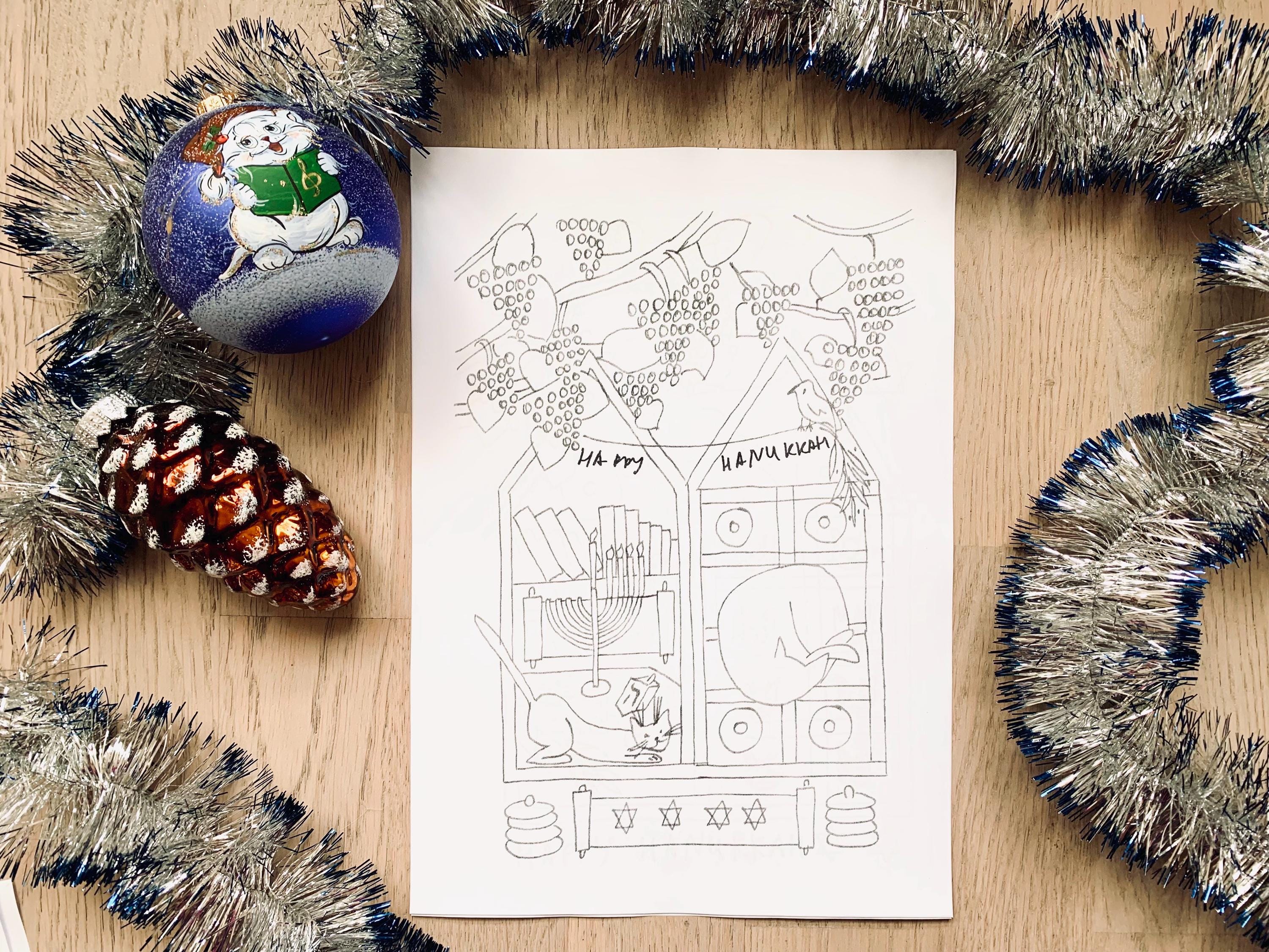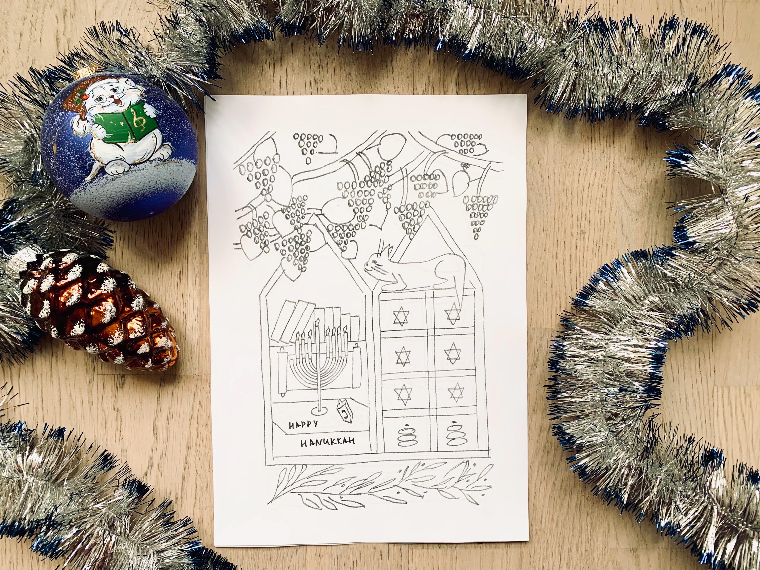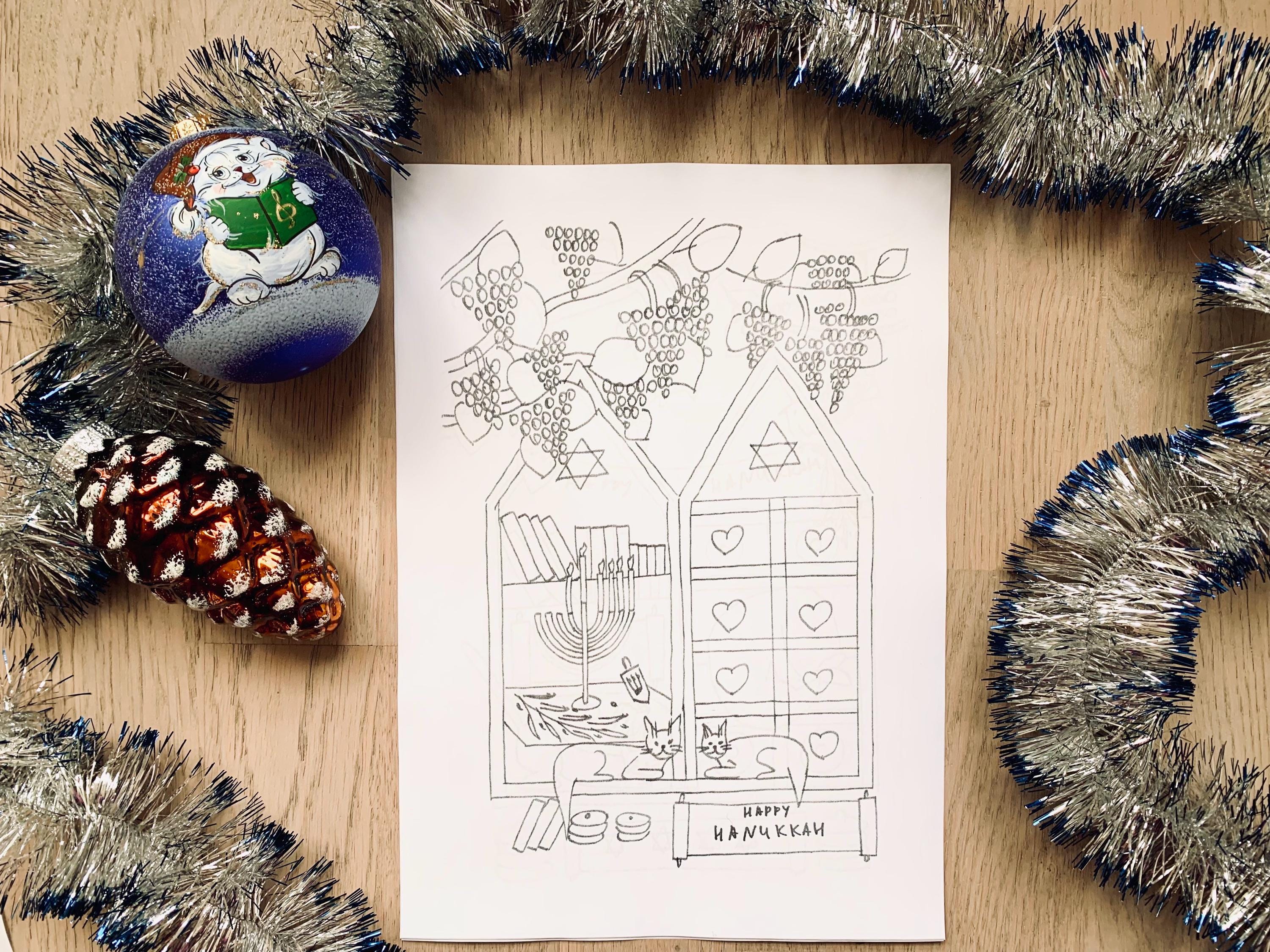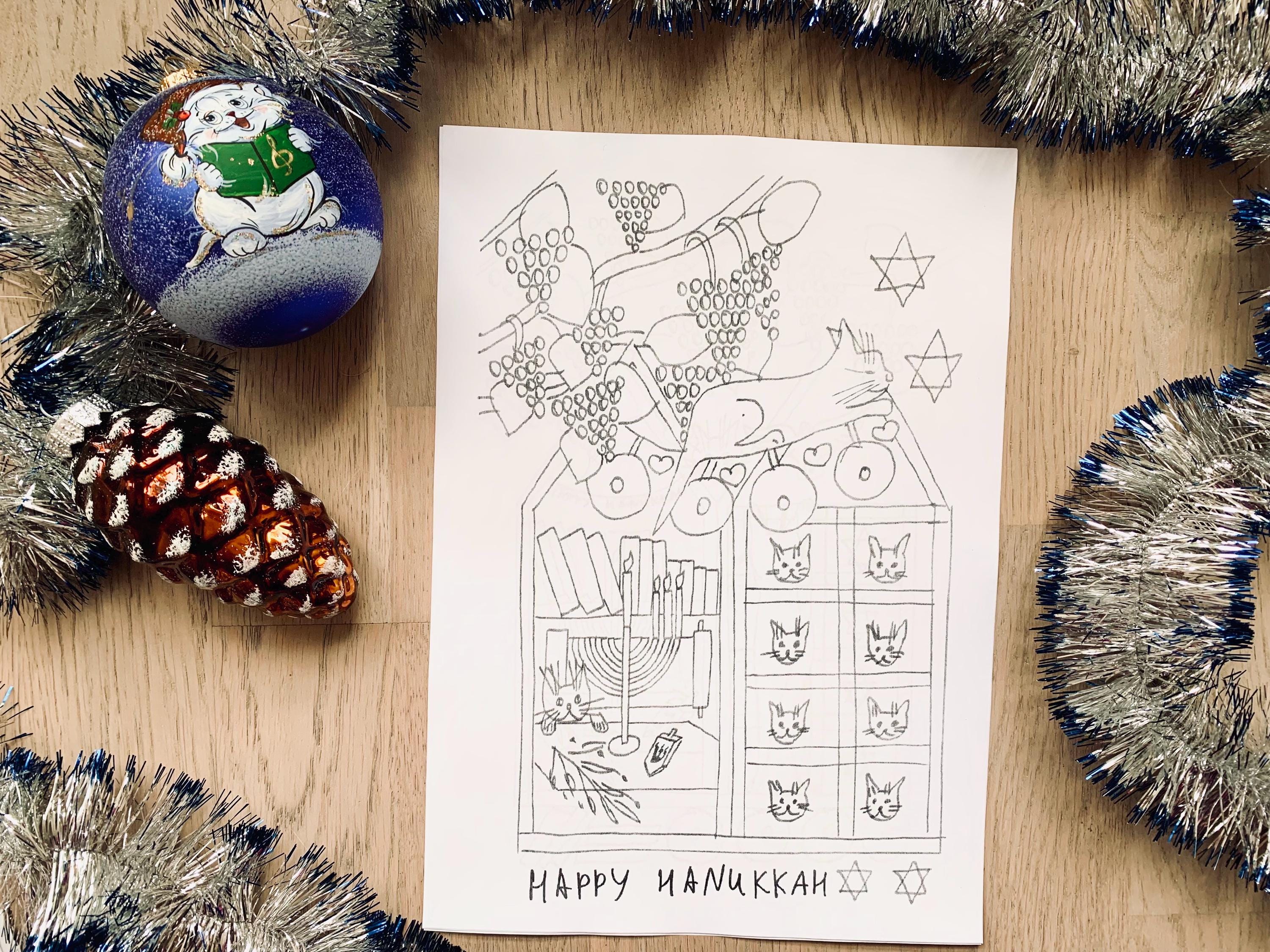 This cozy hand-drawn Coloring set captures the warmth of the Festival of Lights - menorahs, dreidels, candles, and sweet winter moments with Molly the cat.